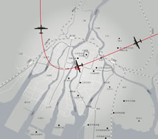 | この図は、六日朝八時十五分 北東方向から市内に侵入してきた米軍のB29が、原爆投下後、全速力で北に向けて飛び去ったとの証言を元にした。 |